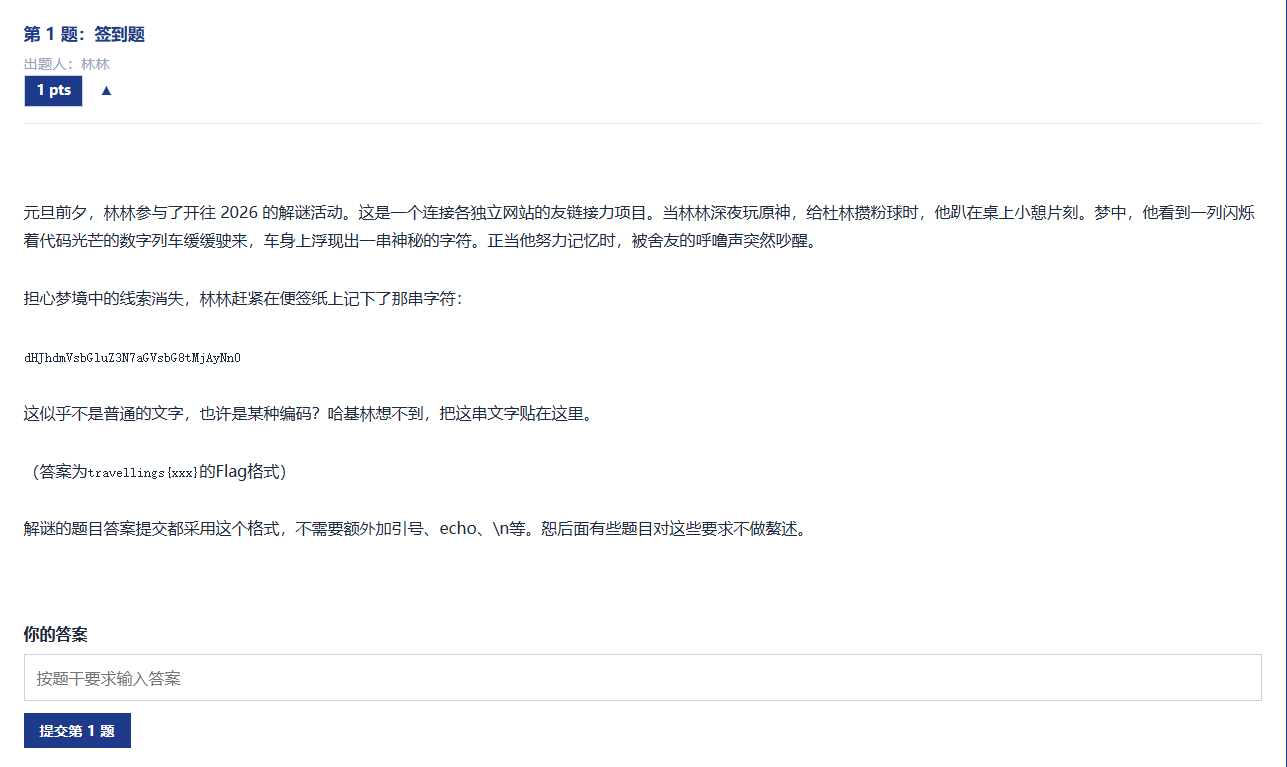 第一眼看到dHJhdmVsbGluZ3N7aGVsbG8tMjAyNn0像是Base64 编码,因为它的字符集符合 Base64 的常见特征(大小写字母、数字、+、/,不过这里只有字母和数字,末尾有一个 = 或没有,这里是 = 被省略的情况)。